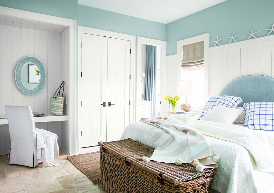 Navy, baby blue, turquoise–the color blue is varied and dynamic. Dark blues, like Hale Navy HC-154 and Gentleman’s Gray 2062-20, are often popular for offices and studies. Lighter, silvery blues are favorites for bathrooms and bedrooms thanks to the serenity and calm this favorite color evokes.