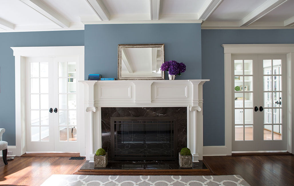 Mt. Rainier Gray 2129-60 and November Skies 2128-50 are among our favorite blue-gray paints. Here, a deep blue-gray living room is balanced with classic white architectural details.