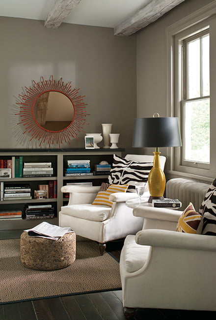 Deep taupes create cozy enclaves, as seen in this welcoming living room corner. Homeowners love snuggling up surrounded by Sparrow AF-720, another great color from our Affinity® collection.