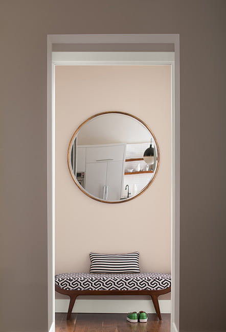 Here, an accent wall in beige-pink Soft Satin 2164-60 creates a striking yet subtle color flow from a Driftwood 2107-40-painted room to the hallway beyond.